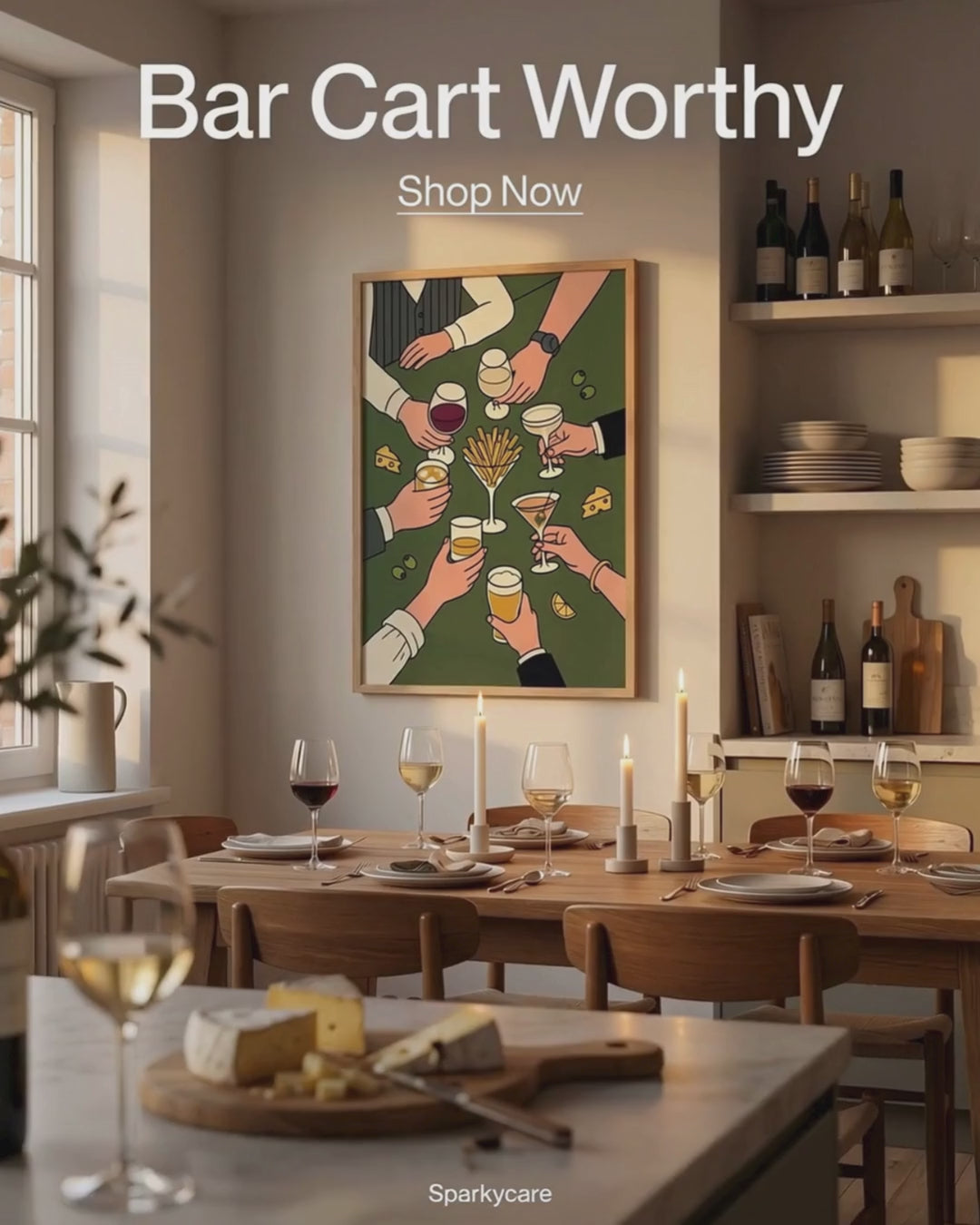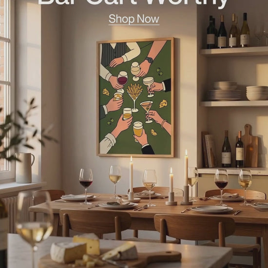 Picture this above your dining table. You sit down for dinner, look up, and see the same scene playing out on the wall that is about to play out on your table. The warm olive green tones and matte finish mean zero glare from overhead lights, so it looks good whether you are eating brunch at noon or opening wine at 10 PM. The food details make it feel like it belongs in a kitchen. The cocktail details make it feel like it belongs above a bar cart. The retro style makes it feel like it belongs in a gallery. It works because it is not trying to be one thing. It is capturing the best parts of all of them at once.